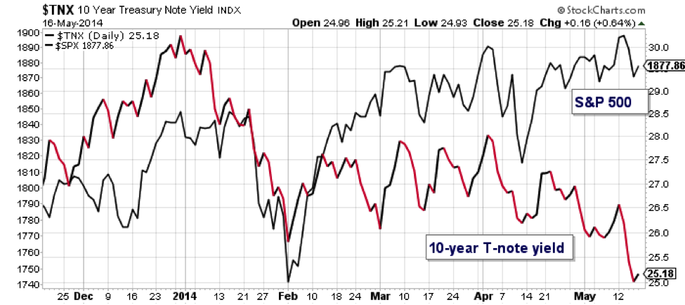 “One of the most striking features of 2014 has been falling Treasury yields in the wake of the Fed’s tapering of QE. The standard theory goes that, as the Fed withdraws support for longer-dated bonds, bond prices will drop (as demand falls) and yields (which move inversely to prices) will rise. So much for standard theory… In addition to the divergence between large caps and small caps (which we wrote about here formerly/http://click.billbonnersdiary.com/t/Ew/AA/AA/AA/AA/Ud0/AQ/S3lE and here formerly/http://click.billbonnersdiary.com/t/Ew/AA/AA/AA/AA/Ud4/AQ/NrN2), the divergence between falling bond yields and rising large-cap stock prices is another sign that the rally in the S&P 500 and the Dow may not be as strong as some believe.”